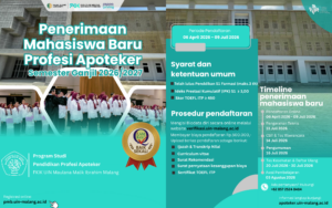 Malang, 23 April 2026-Fakultas Kedokteran dan Ilmu Kesehatan Universitas Islam Negeri Malang (UIN Malang) kembali melahirkan generasi apoteker baru melalui prosesi Sidang Terbuka Pengucapan Lafal Sumpah Apoteker. Kegiatan ini dilaksanakan pada Kamis, 23 April 2026, bertempat di The Alana Hotel Malang. Pada periode tersebut, sebanyak 39 lulusan resmi dikukuhkan sebagai apoteker baru. Jumlah tersebut terdiri atas 5 laki-laki dan 34 perempuan. Acara ini dihadiri oleh Rektor UIN Maulana Malik Ibrahim Malang Prof. Dr. Hj. Ilfi Nur Diana, M.Si., CAHRM., CRMP., Dekan Fakultas Fakultas Kedokteran Prof. Dr. dr. Yuyun Yueniwati P.W., M.Kes, Sp. Rad(k), dan seluruh wakil dekan serta Ketua Prodi Profesi Apoteker Fakultas Kedokteran dan Ilmu Kesehatan UIN Maulana Malik Ibrahim Malang.